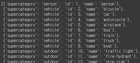- supercategory: 카테고리에 해당하는 부모 카테고리(따라서 부모 카테고리는 더 포괄적임)