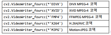 VideoWriter_fourcc() : 코덱은 영상을 복원/압축하는 기술을 말합니다. 이 메서드를 사용해 그 종류를 정할 수 있습니다.