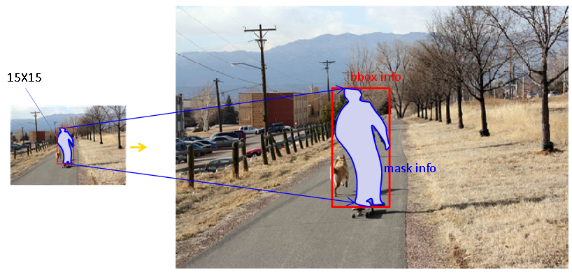 위 그림에서는 15X15에 bbox도 표시했지만, 실제로 bbox는 원본 이미지 기준으로 나오고 mask 정보만 15X15 안에서 나옵니다.(15X15에 그려진 bbox는 이해하기 쉬우라고 그린 것입니다.)