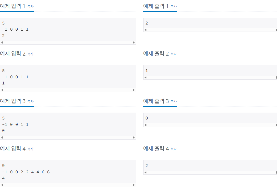 첫째 줄에 트리의 노드의 개수 N이 주어진다. N은 50보다 작거나 같은 자연수이다. 둘째 줄에는 0번 노드부터 N-1번 노드까지, 각 노드의 부모가 주어진다. 만약 부모가 없다면 (루트) -1이 주어진다. 셋째 줄에는 지울 노드의 번호가 주어진다.