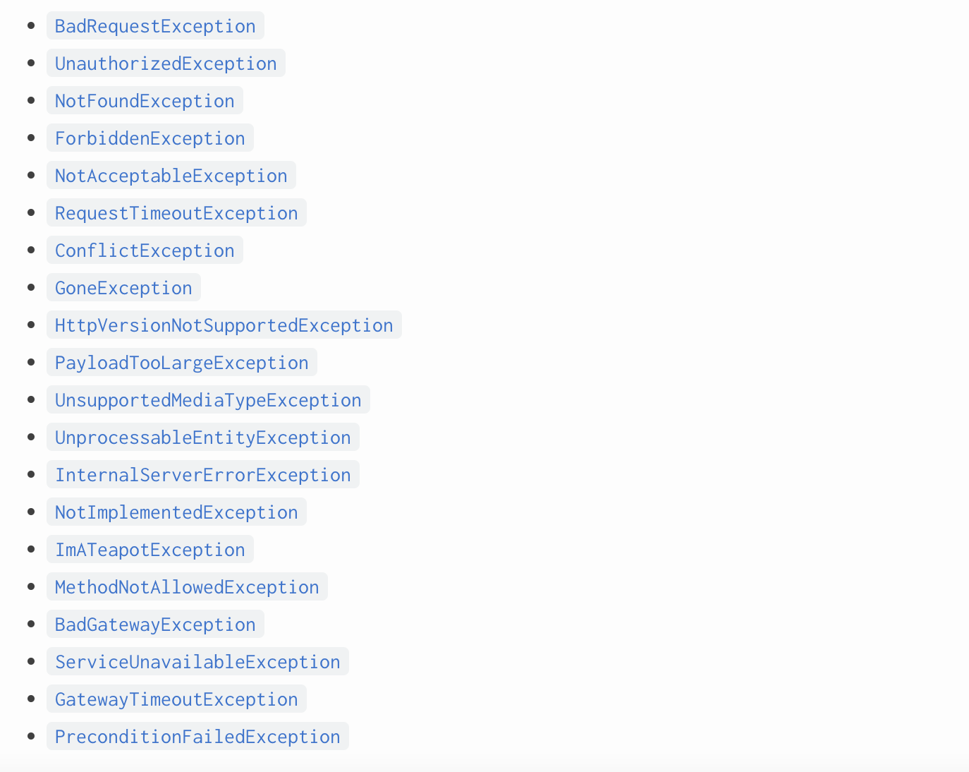 Nest는 기본적으로 HttpException에서 상속되는 표준 예외를 제공한다. @nestjs/common 패키지에서 expose 되며 가장 일반적인 HTTP 예외를 나타낸다.