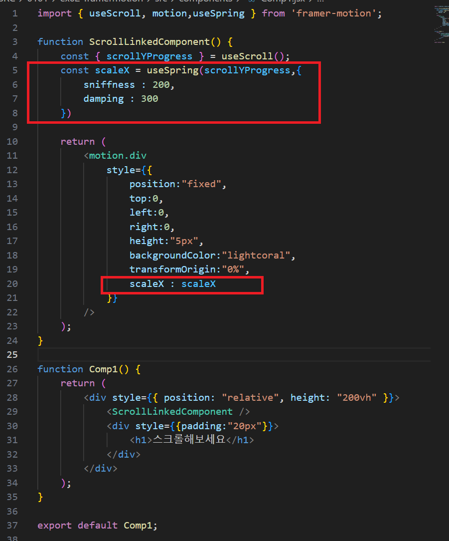 ❗ 사용 전 useScroll 을 Framer Motion에서 가져와야한다.