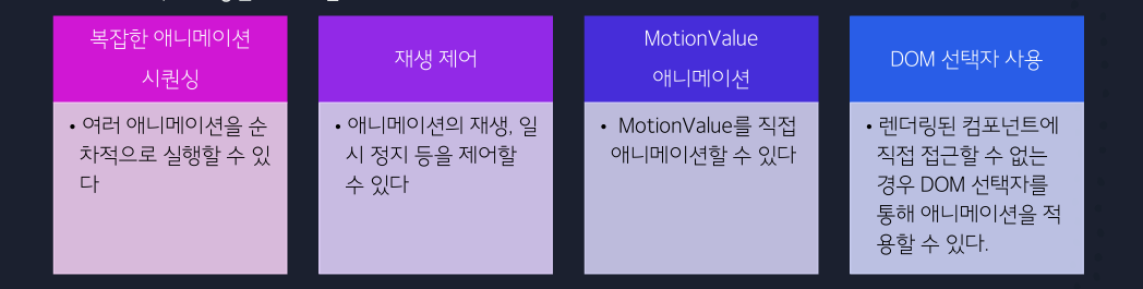 일반 태그 혹은 컴포넌트 하위 요소에 애니메이션을 적용하고 싶을 때 사용할 수 있다. 이를 통해 특정 요소에 애니메이션을 적용하고, 컴포넌트가 제거될 때 자동으로 정리할 수 있다.