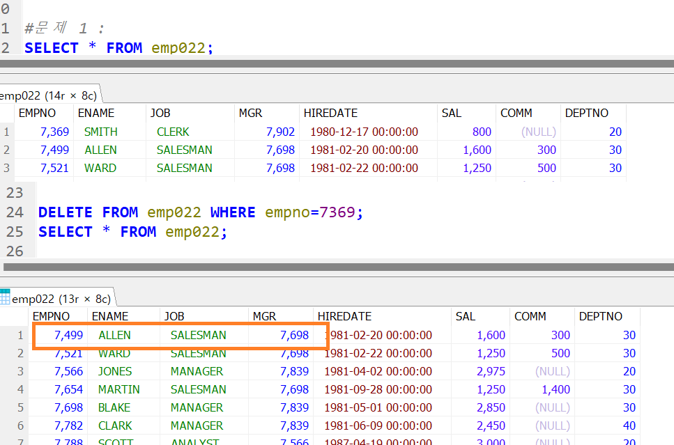 특정 사원(empno가 7369인)의 데이터를 삭제하는 쿼리: