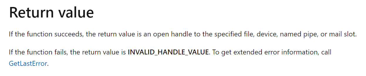 함수의 리턴값을 알아보면, 함수가 실패했을 경우 INVALID_HANDLE_VALUE가 반환된다고 한다. 이 값은 -1 (FFFFFFFF) 이다.
