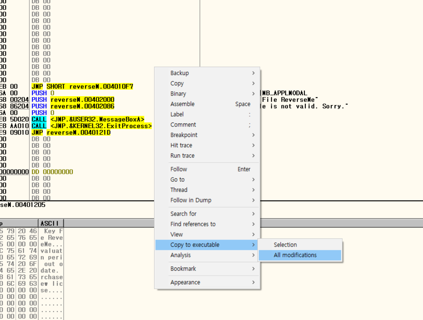 마우스 우클릭 - Copy to executable - All modifications로 패치한 부분 포함해서 전체 파일을 저장한다.