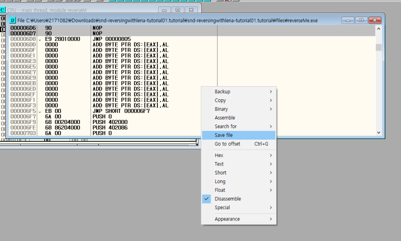 새로 생성된 창에서 마우스 우클릭 - Save file로 새로운 실행파일을 저장한다.