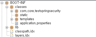 BOOT-INF 폴더의 내부 구조이다. BOOT-INF 폴더는 애플리케이션의 자바 코드를 컴파일 한 .class파일과 여러 리소스 파일을 가지고 있다. jar 파일이 실행되면 해당 폴더에 있는 파일들을 읽도록 지정되어 있다.