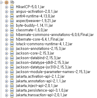 libs 폴더에는 코드 실행에 필요한 외부 라이브러리들이 jar형태로 존재한다. 스프링부트는 중첩된 Jar 파일(Jar파일 안의 Jar파일을 말함)을 로드하는 데 사용되는 클래스인 org.springframework.boot.loader.jar.NestedJarFile