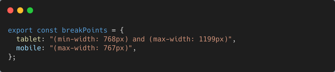 위와같이 작성할 경우 디바이스를 나누는 기준이 바뀔 때 하나하나 전부 바꿔주어야 하므로 기준을 나누는 컴포넌트를 하나 만들어서 사용한다.