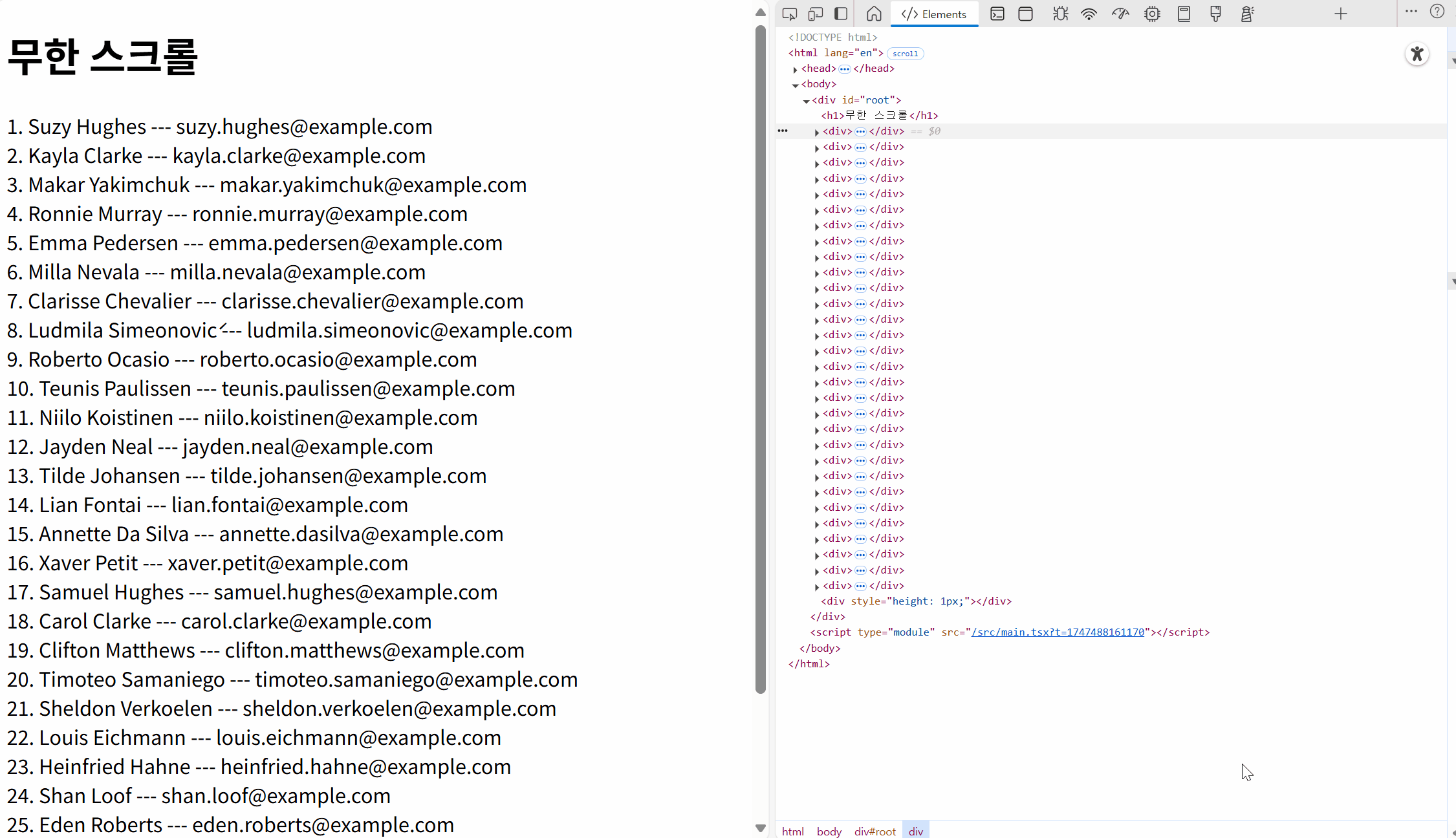 오른쪽을 보면, div 요소가 계속 아래에 축적되어 늘어나는 것을 볼 수 있습니다.
