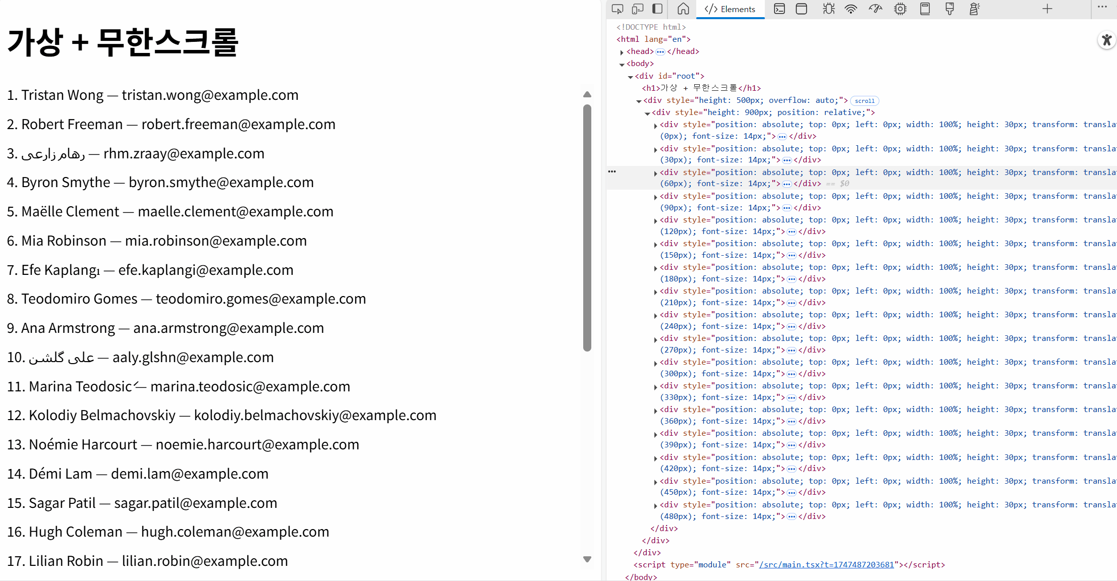 500px)의 div를 가상 스크롤 뷰포트로 만들고, 내부에서만 스크롤되도록 overflow: auto를 적용가상 스크롤 구성