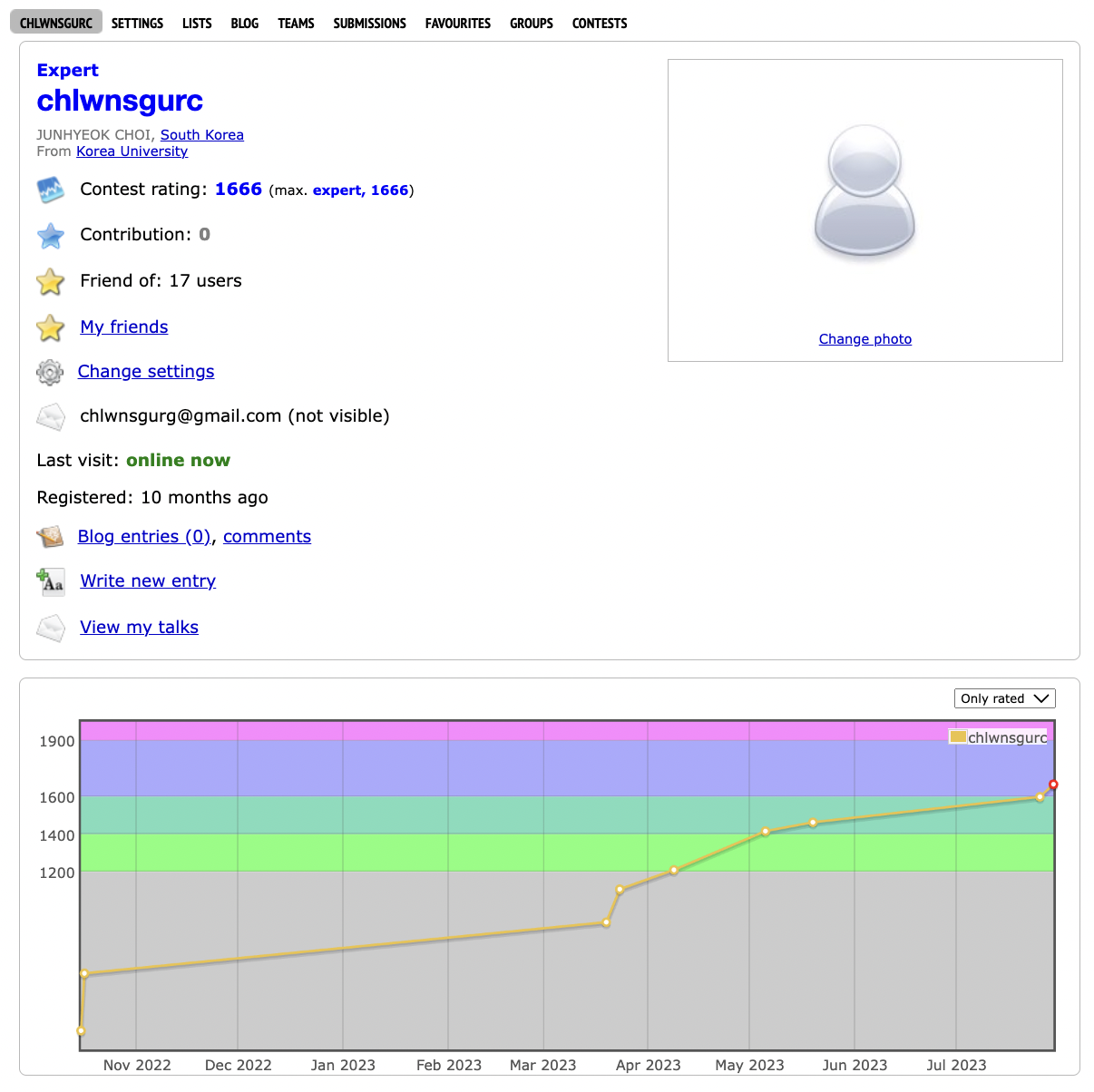 백준 아이디에 색깔 달려있는 거 보면 멋있어 보여서 한 번 해보려고는 했지만, 코드포스를 본격적으로 시작하게 된 것은 코포 블루를 찍어야 PS 팀에 들어갈 수 있다는 이야기를 들은 다음부터였던 것 같다. 또올해는 ICPC에 꼭 나가보고 싶다는 마음이 컸기에 나름 필사적이었다. 대학 와서 처음으로 뭔가를 열심히 한 것 같다