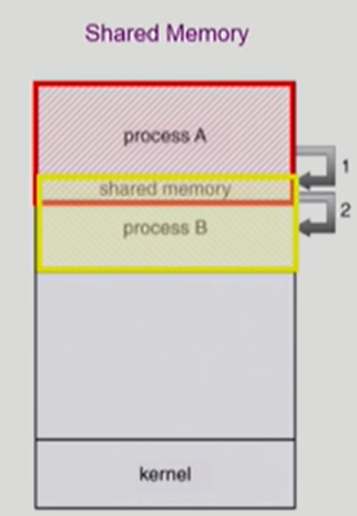 두 프로세스가 일부 공간을 공유하게 함으로써 한 프로세스가 공유 공간에 작성한 내용을 다른 프로세스에서 확인 가능하도록 하는 방식이다. 프로세스끼리 직접 공유하지는 못하고 shared memory를 사용하겠다는 시스템 콜을 통해 커널에 요청을 해서 커널이 shared memory를 매핑해주면 공유가 가능해진다.