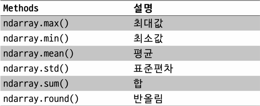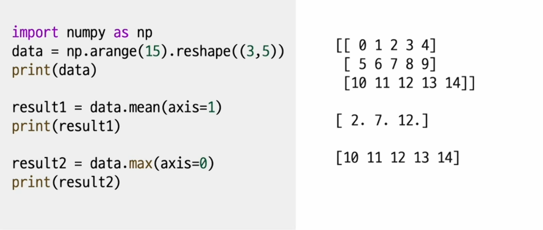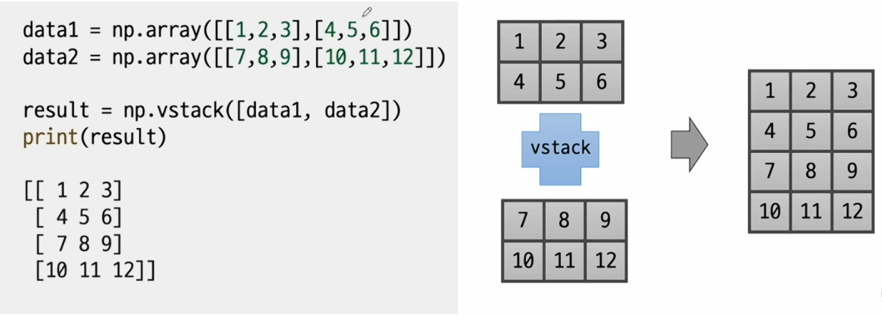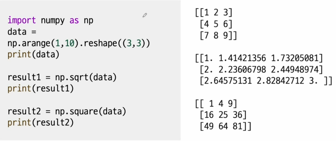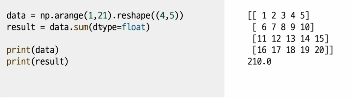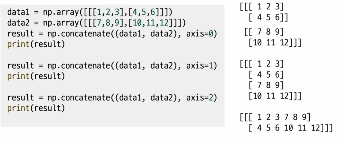 data = np.arange(1,21).reshape((4,5)) result = data.sum(dtype=float) print(data) print(result)출력 : [[ 1 2 3 4 5] [ 6 7 8 9 10] [11 12 13 14 15] [16 17 18 19 20]] 출력 : 210.0data = np.arange(24).reshape((3,2,4)) print(data) print(data.shape)출력 : [[[ 0 1 2 3] [ 4 5 6 7]] [[ 8 9 10 11] [12 13 14 15]] [[16 17 18 19] [20 21 22 23]]] 출력 : (3, 2, 4)result1 = data.sum(axis=0) print(result1) print(result1.shape)출력 : [[24 27 30 33] [36 39 42 45]] 출력 : (2, 4)result2 = data.sum(axis=1) print(result2) print(result2.shape)출력 : [[ 4 6 8 10] [20 22 24 26] [36 38 40 42]] 출력 : (3, 4)result3 = data.sum(axis=2) print(result3) print(result3.shape)출력 : [[ 6 22] [38 54] [70 86]] 출력 : (3, 2)data = np.arange(24).reshape((3,2,4)) print(data) print(data.shape)출력 : [[[ 0 1 2 3] [ 4 5 6 7]] [[ 8 9 10 11] [12 13 14 15]] [[16 17 18 19] [20 21 22 23]]] 출력 : (3, 2, 4)result1 = data.max(axis=0) print(result1) print(result1.shape)출력 : [[16 17 18 19] [20 21 22 23]] 출력 : (2, 4)result2 = data.max(axis=1) print(result2) print(result2.shape)출력 : [[ 4 5 6 7] [12 13 14 15] [20 21 22 23]] 출력 : (3, 4)result3 = data.max(axis=2) print(result3) print(result3.shape)출력 : [[ 3 7] [11 15] [19 23]] 출력 : (3, 2)data = np.arange(15).reshape((3,5)) print(data)출력 : [[ 0 1 2 3 4] [ 5 6 7 8 9] [10 11 12 13 14]]result1 = data.mean(axis=1) print(result1)출력 : [ 2. 7. 12.]result2 = data.min(axis=0) print(result2)출력 : [0 1 2 3 4]data = np.arange(1,10, dtype=float).reshape((3,3)) print(data)출력 : [[1. 2. 3.] [4. 5. 6.] [7. 8. 9.]]result1 = np.sqrt(data) print(result1)출력 : [[1. 1.41421356 1.73205081] [2. 2.23606798 2.44948974] [2.64575131 2.82842712 3. ]]result2 = np.square(data) print(result2)출력 : [[ 1. 4. 9.] [16. 25. 36.] [49. 64. 81.]]result3 = np.sin(data) print(result3)출력 : [[ 0.84147098 0.90929743 0.14112001] [-0.7568025 -0.95892427 -0.2794155 ] [ 0.6569866 0.98935825 0.41211849]]data1 = np.array([[1,2,3],[4,5,6]]) data2 = np.array([[7,8,9],[10,11,12],[10,11,12]])print(data1) print(data2)출력 : [[1 2 3] [4 5 6]] 출력 : [[ 7 8 9] [10 11 12] [10 11 12]]result = np.vstack((data1, data2)) print(result)출력 : [[ 1 2 3] [ 4 5 6] [ 7 8 9] [10 11 12] [10 11 12]]data1 = np.array([[1,2,3],[4,5,6]]) data2 = np.array([[7],[10]]) data3 = np.array([[8,9],[11,12]])print(data1) print(data2)출력 : [[1 2 3] [4 5 6]] 출력 : [[ 7] [10]]result = np.hstack((data1, data2, data3)) print(result)출력 : [[ 1 2 3 7 8 9] [ 4 5 6 10 11 12]]data1 = np.array([[1,2,3],[4,5,6]]) data2 = np.array([[7,8,9],[10,11,12]]) result = np.concatenate((data1, data2), axis=0) print(result)출력 : [[ 1 2 3] [ 4 5 6] [ 7 8 9] [10 11 12]]result = np.concatenate((data1, data2), axis=1) print(result)출력 : [[ 1 2 3 7 8 9] [ 4 5 6 10 11 12]]data1 = np.array([[[1,2,3],[4,5,6]]]) data2 = np.array([[[7,8,9],[10,11,12]]]) print(data1) print(data1.shape) print(data2) print(data2.shape) print("-"*10)출력 : [[[1 2 3] [4 5 6]]] 출력 : (1, 2, 3) 출력 : [[[ 7 8 9] [10 11 12]]] 출력 : (1, 2, 3)result = np.concatenate((data1, data2), axis=0) print(result)출력 : [[[ 1 2 3] [ 4 5 6]] [[ 7 8 9] [10 11 12]]]result = np.concatenate((data1, data2), axis=1) print(result)출력 : [[[ 1 2 3] [ 4 5 6] [ 7 8 9] [10 11 12]]]result = np.concatenate((data1, data2), axis=2) print(result) # print("-"*10) # result = np.hstack((data1, data2)) # print(result)출력 : [[[ 1 2 3 7 8 9] [ 4 5 6 10 11 12]]]