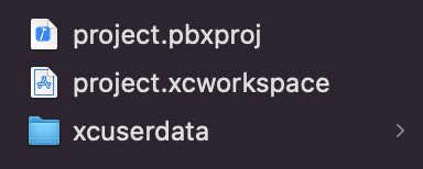 우선 Finder에서 .xcodeproj 확장자를 가진 파일 위에 오른쪽 마우스를 눌러 패키지 내용 보기 를 누르면 다음과 같이 세 개의 파일을 볼 수 있다. 이 중에서 .pbxproj 파일을 열어서 몇 가지를 수정해주면 된다.
