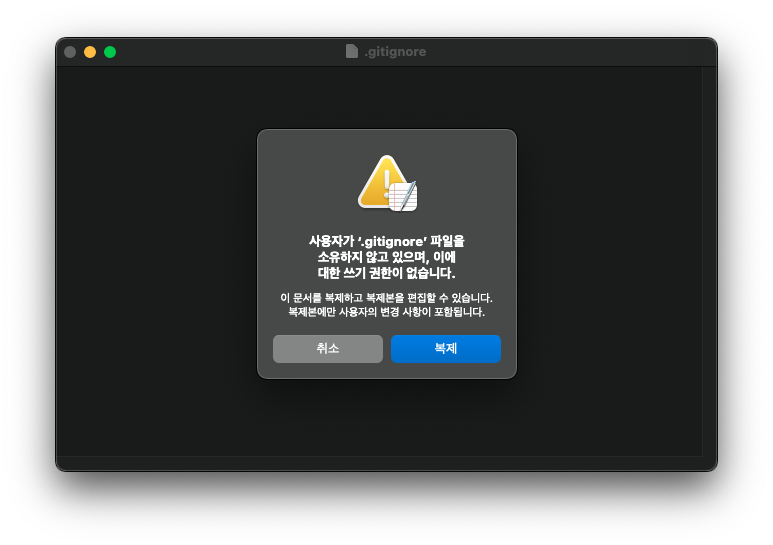 혹시 아래와 같이 쓰기 권한이 없다고 나오는 경우에는 Finder에서 .gitignore 파일을 우클릭한 후, 정보 가져오기를 눌러 공유 및 사용 권한에서 본인을 추가하고 읽기 및 쓰기 권한을 부여해주면 된다.