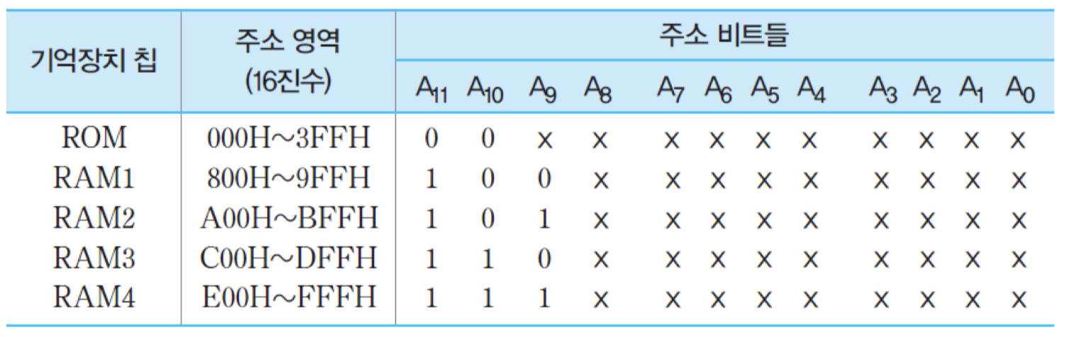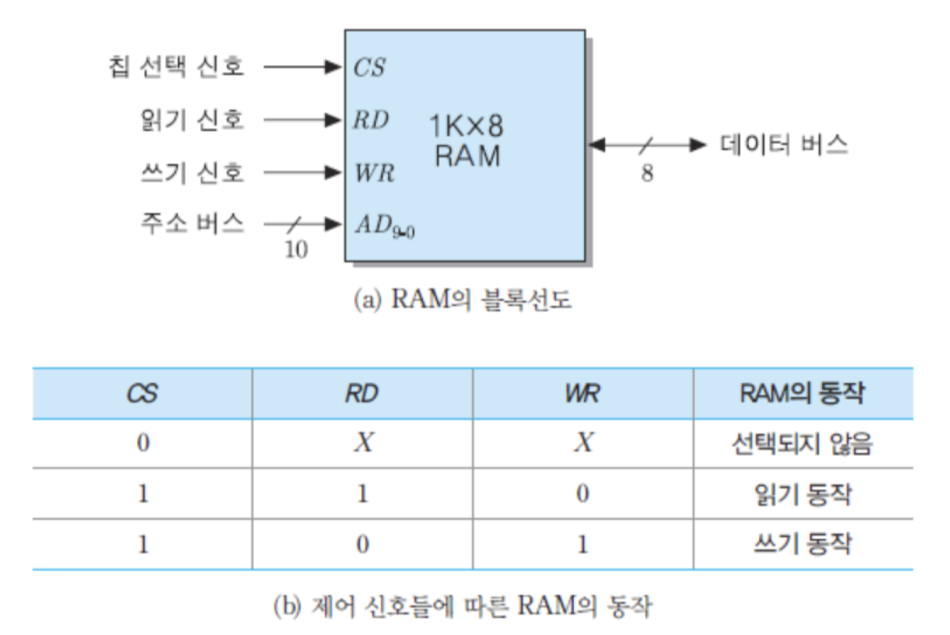 그림 (a)에서 제어 입력 신호인 RD는 읽기 명령 신호이고, WR은 쓰기 명령 신호임. 기억장치시스템이 여러 개의 칩들로 구성되는 경우에는 칩 선택 신호인 CS에 의해 칩의 선택 여부가 결정됨. CS 신호가 1로 활성화되면, 칩은 주소와 제어 신호에 따라 적절한 동작을 수행함. 만약 RD = 1이고 WR = 0이라면, 주소가 지정하는 기억 장소로부터 8비트 데이터가 읽혀서 데이터 버스를 통하여 출력됨. 만약 RD = 0이고 WR = 1이면, 데이터 버스를 통하여 들어오는 8-비트 데이터가 주소에 의해 지정되는 기억 장소에 저장됨. 그러나 CS 신호가 0인 경우에는 이 칩이 선택되지 않은 것이므로, 제어 신호들이나 데이터 입출력 통로가 모두 전기적으로 단절된 상태가 됨. 그림 (b)에서는 X는 해당 신호가 0혹은 1중의 어느 값이든 상관없다는 것을 의미함.