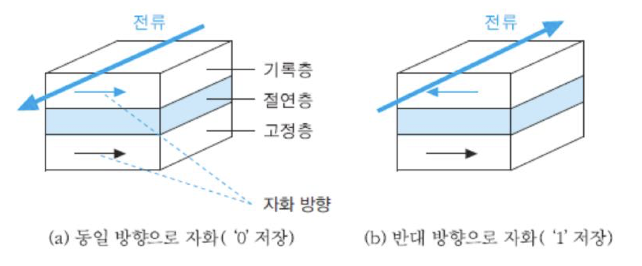 MRAM : 강자성체에서 자화되는 방향을 조절하여 2진 정보를 저장하는 반도체 기억장치