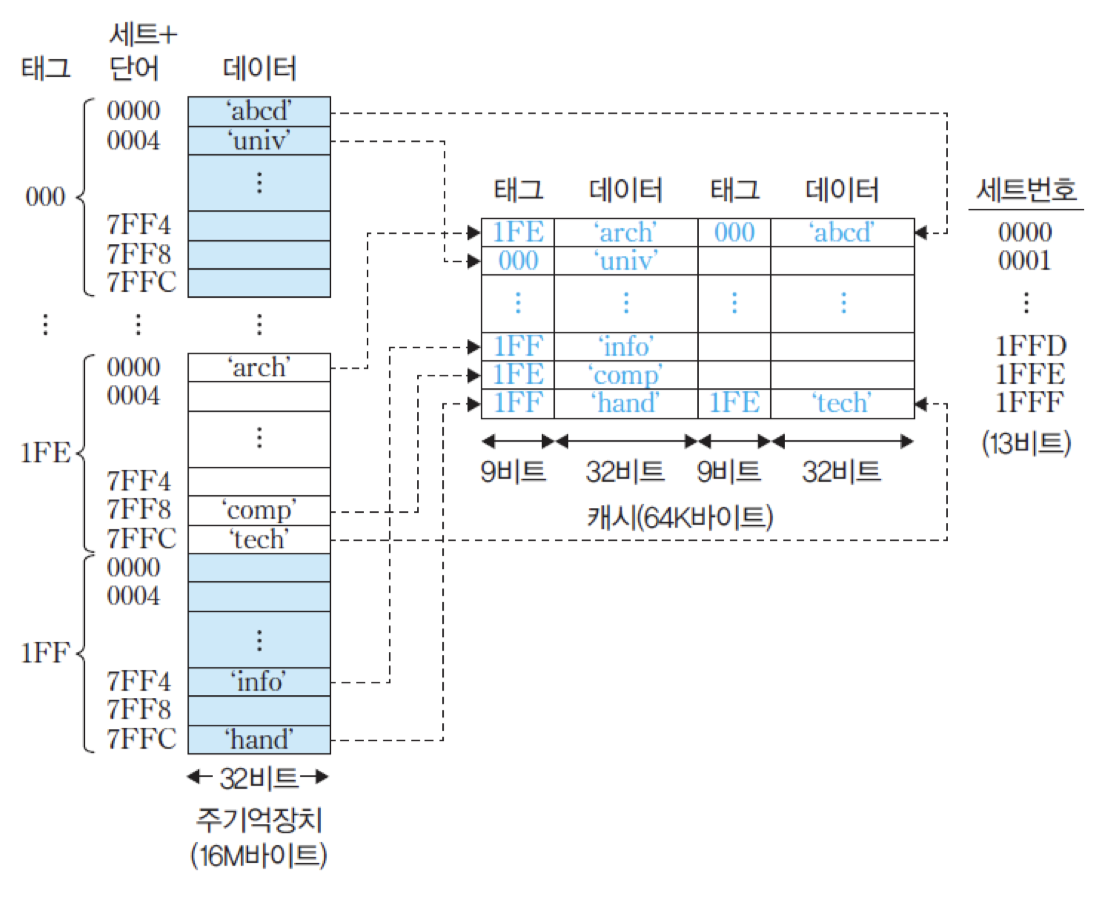 그림은 이와 같은 2-way 세트-연관 사상을 위한 조직을 보여주고 있음. 주기억장치에는 같은 태그값을 가지는 블록들이 캐시의 세트 수와 같은 8K개씩 있음. 예를 들어, 태그가 16진수로 '000'인 블록들이 그 수만큼 있으며, 각각 다른 태그를 가지는 그러한 그룹들이 모두 512개가 있음. 같은 태그를 가지는 블록들은 서로 다른 캐시 세트를 공유함. 따라서 캐시의 각 세트는 512개의 블록들에 의해 공유됨. 즉, 512개의 블록들이 지정된 세트 내의 두 라인들 중 어느 곳으로 적재될 수 있음.