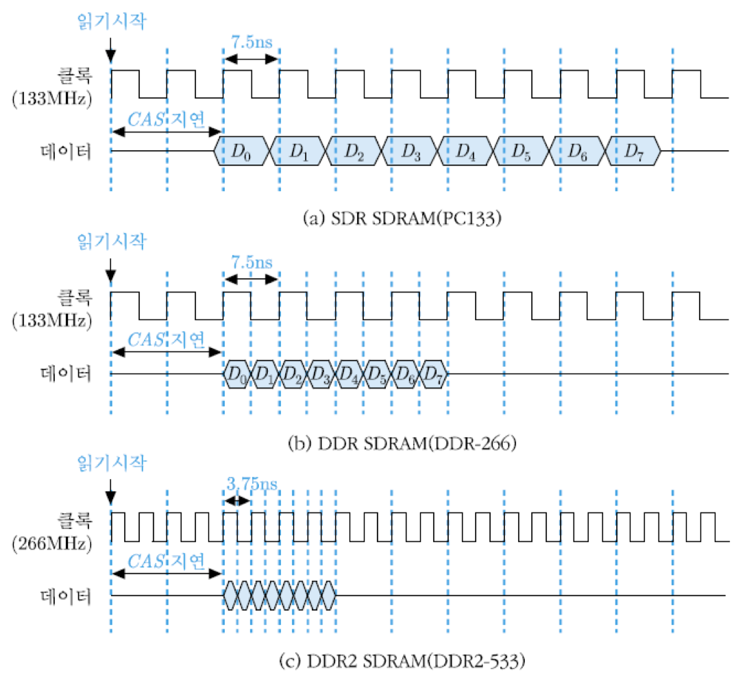 그와는 달리, DDR SDRAM의 경우에는 그림 (b)에서 보는 바와 같이 데이터가 클록 상승 에지뿐 아니라 하강 에지에서도 전송됨. 즉, 첫 번째 데이터는 클록의 상승 에지에서 전송되고, 하강 에지에서는 두 번째 데이터가 전송됨. 따라서 4 클록 주기만에 8개의 데이터들을 모두 전송할 수 있게 됨. 그런데 여기서도 SDRAM의 내부 액세스 속도는 그대로이기 때문에 CAS 지연은 2 클록 주기임. 결과적으로, 전체 데이터 전송시간은 = 15ns + 30ns + 45ns로 줄어들게 됨. 이 경우 버스 클록 주파수는 위의 SDR과 같은 133MHz이지만 두 배의 전송 속도를 가지므로 DDR-266이라고 부름. 그 외에도 DDR SDRAM의 클록 주파수로는 166MHz, 200MHz 등이 사용되고 있으며, 각각은 해당 주파수의 두 배를 나타내는 수치를 사용하여 DDR-333 및 DDR-400이라는 명칭으로 불림.