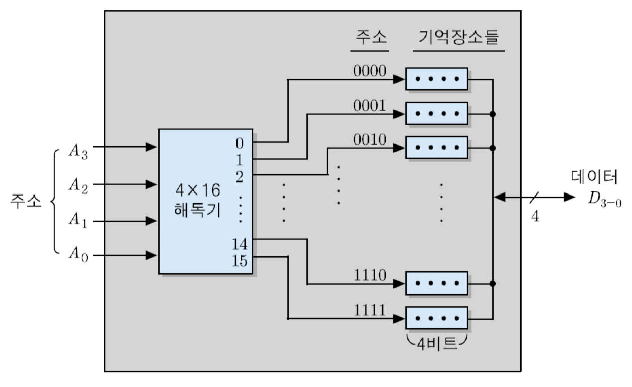 16 x 4비트 조직의 RAM에서는 16개의 기억 장소들이 서로 다른 주소를 할당받으며, 각 기억 장소에는 4-비트 데이터가 저장됨. 이 칩에 대한 주소지정을 위해서는 16 = 2의 4승, 즉 4-비트 주소가 필요하게 됨. 따라서 그림과 같이 4 x 16 해독기가 16개의 출력 신호들 중의 하나를 활성화시킴으로써 각 기억 장소가 선택됨. 이 경우에 칩 내부 기억장소들의 주소 범위는 0번지부터 15번지까지가 되며, 데이터 입출력 선은 4개가 있으면 됨.