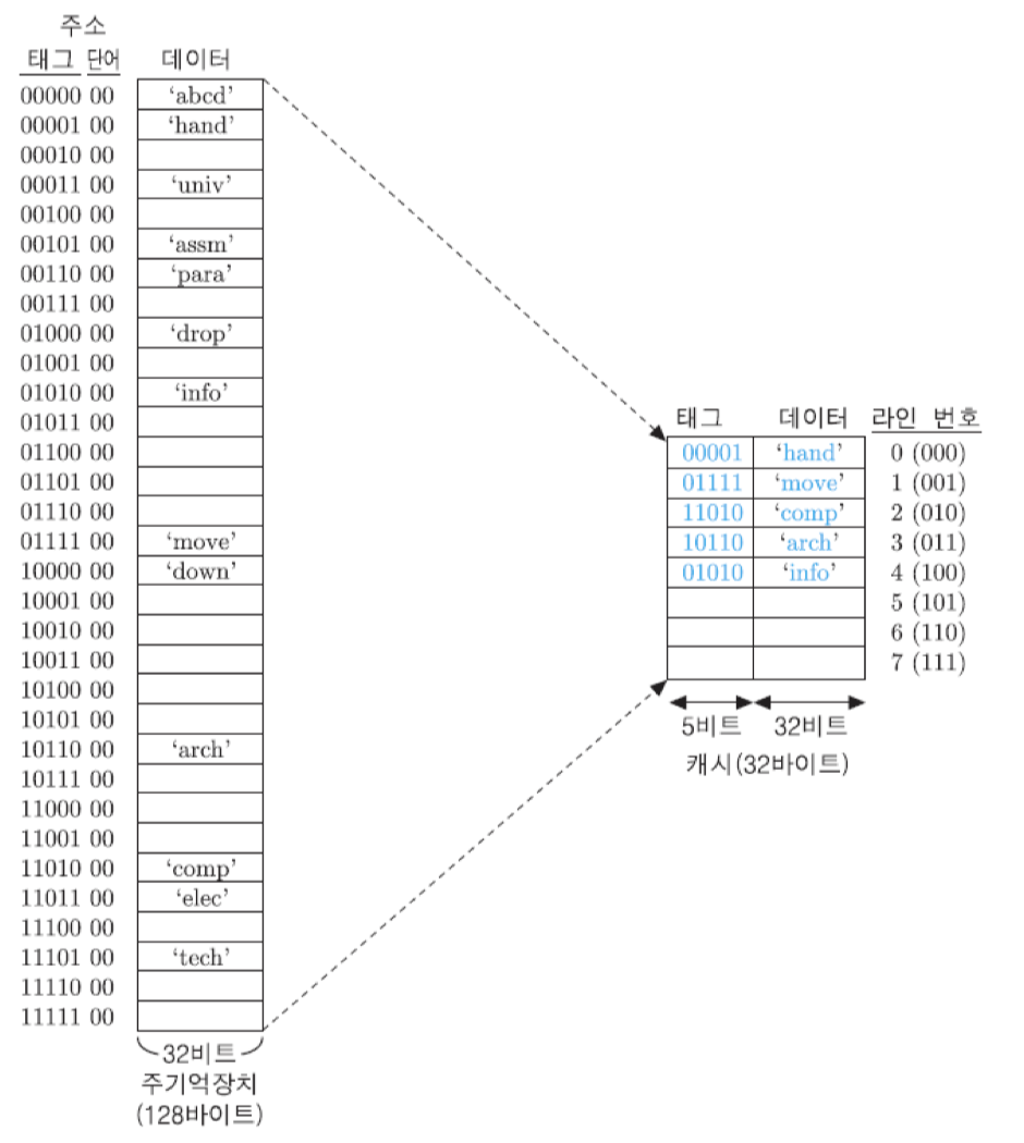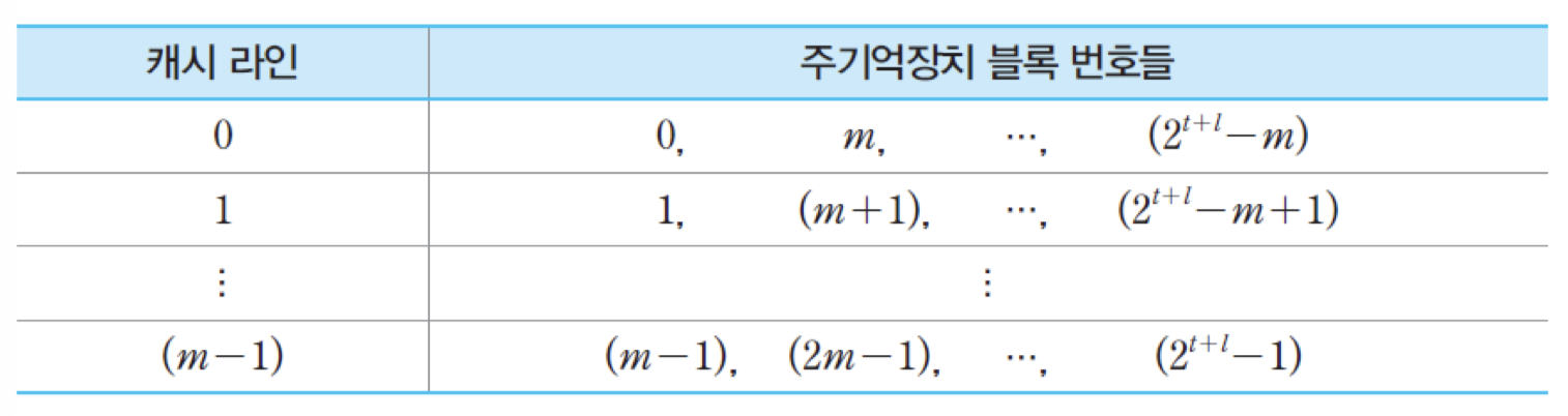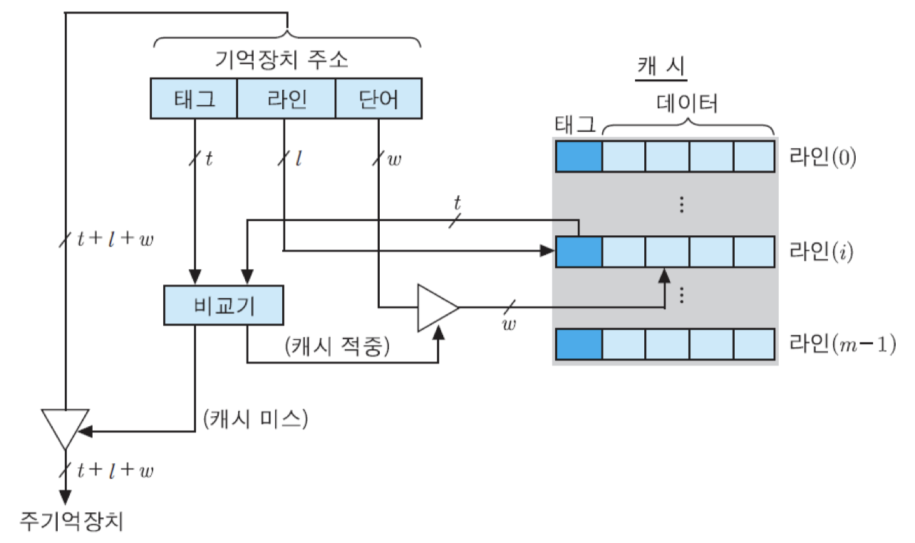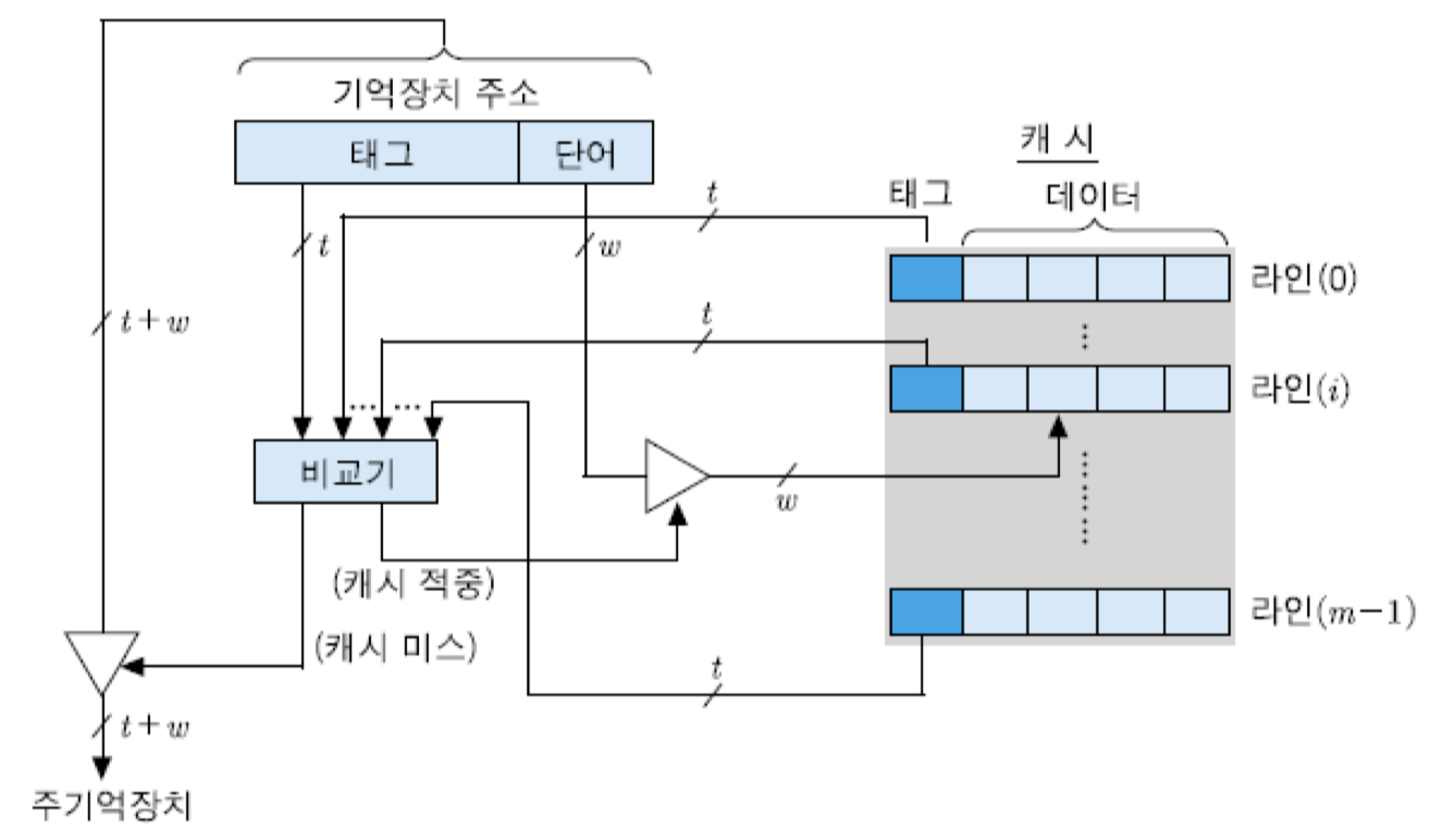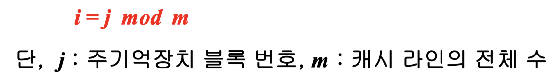 • 주기억장치의 블록 크기가 4바이트이므로 캐시 라인의 크기도 4바이트가 되어야 하며, 결과적으로 라인의 수 m = 16K개