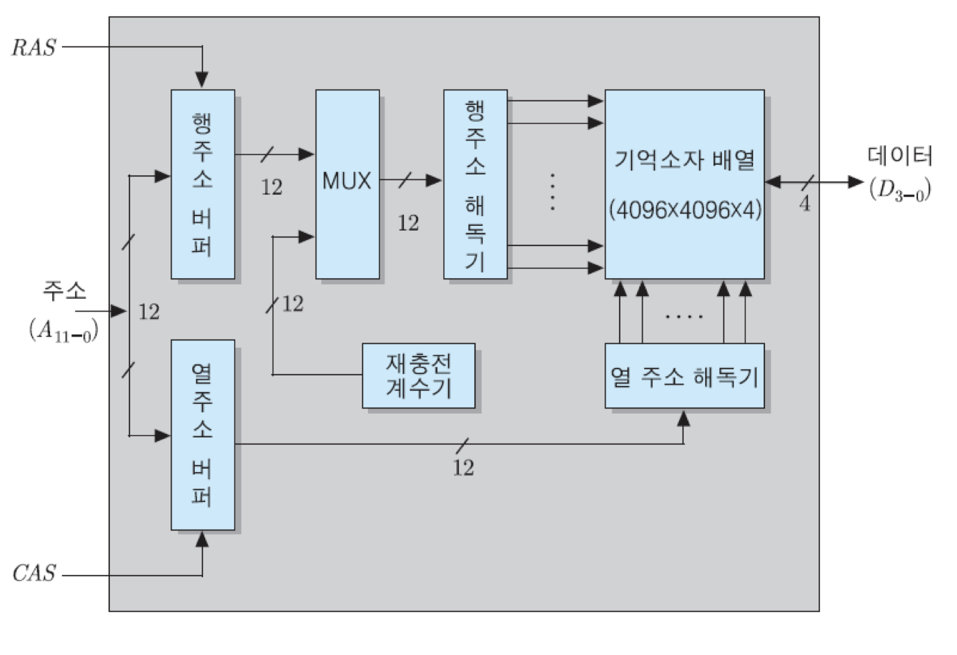 DRAM에는 그림에서 보는 바와 같이 재충전 회로가 포함되어 있음. 이 회로의 핵심 요소인 재충전 계수기는 0부터 4095까지의 주소를 순서대로 발생하며, 그 주소는 기억장치 액세스가 일어나지 않는 사이클 동안에 내부의 멀티플렉서에 의해 선택되어 행 주소 해독기로 보내짐. 그러면 그 주소가 지정하는 행에 위치한 모든 기억 소자들이 동시에 선택되어 재충전됨. 재충전 동작은 각 행에 공통으로 접속된 재충전 신호 선으로 전기를 인가하여 '1'이 저장되어 있는 기억 소자들을 충전함으로써 이루어짐.