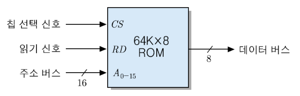 그림은 64Kx8비트 조직을 가진 ROM의 블록 선도를 보여주고 있음. ROM은 읽기만 가능하기 때문에 WR 신호는 필요 없고 RD 신호만 있으면 됨. 또한 64K = 2의 16승 이므로, 16비트의 주소가 입력되어야 함. 칩 선택 신호인 CS와 읽기 신호가 활성화되면, 주소가 지정하는 기억 장소로부터 데이터가 읽혀져서 데이터 버스에 실리게 됨. 대부분의 ROM은 데이터 출력 선이 8개인 조직을 사용하며, 용량도 바이트 단위로 표시함. 따라서 그림의 칩은 64KByteROM이라고 부름.