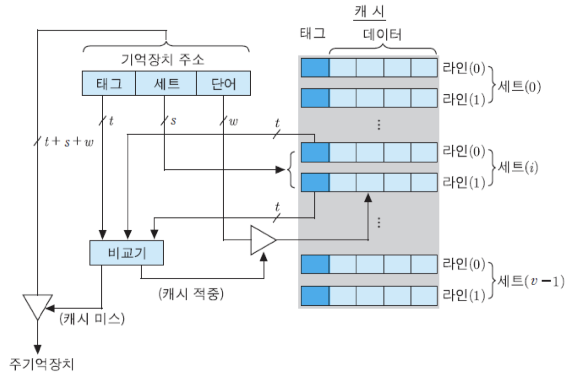 CPU에 의해 기억장치 주소가 발생되어 캐시 액세스 동작이 시작되면, 먼저 2-비트 세트 번호를 이용하여 세트를 선택함. 그런 다음에는 그 세트 내 라인들의 태그 중에서 기억장치 주소의 태그와 일치하는 것이 있는 지 검사함. 만약 태그가 일치하는 라인이 있다면, 캐시가 적중된 것이므로 최하위 두 비트들을 이용하여 그 라인에 저장된 네 단어들 중의 하나를 선택하여 인출함. 만약 세트 내의 어느 태그도 주소의 태그와 일치하지 않는다면, 캐시 미스가 발생한 것이므로 주기억장치 액세스가 시작됨.