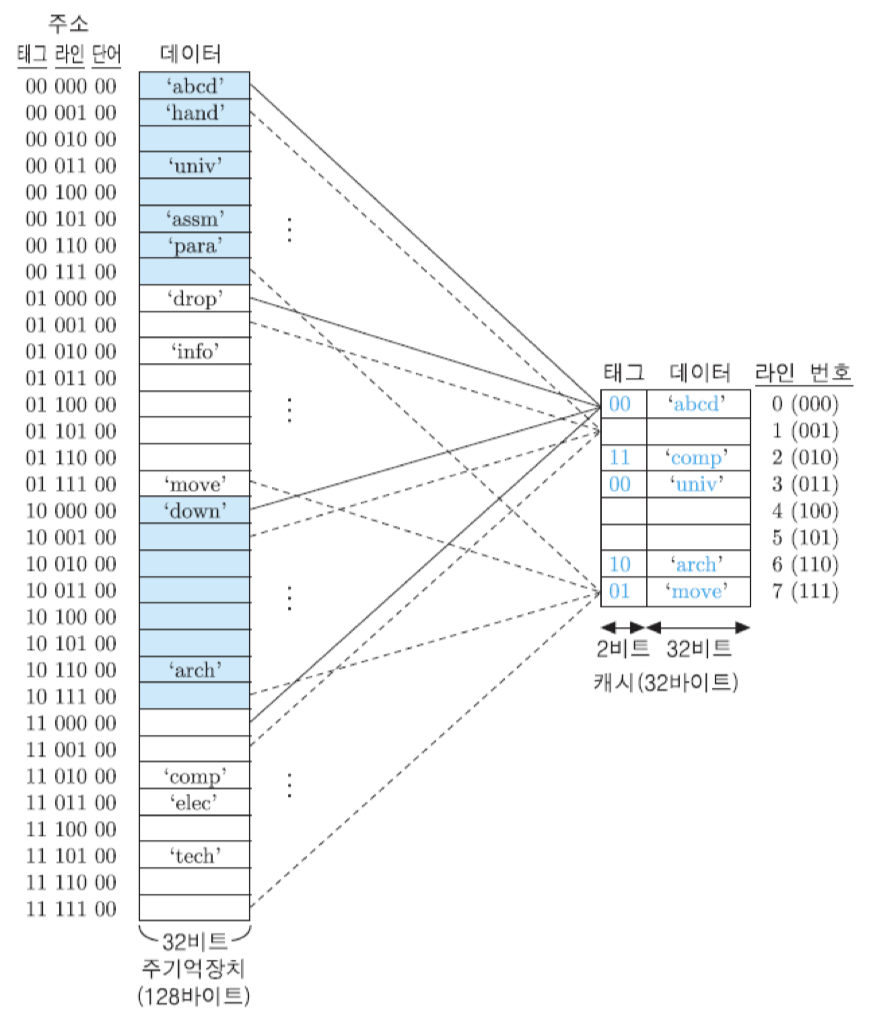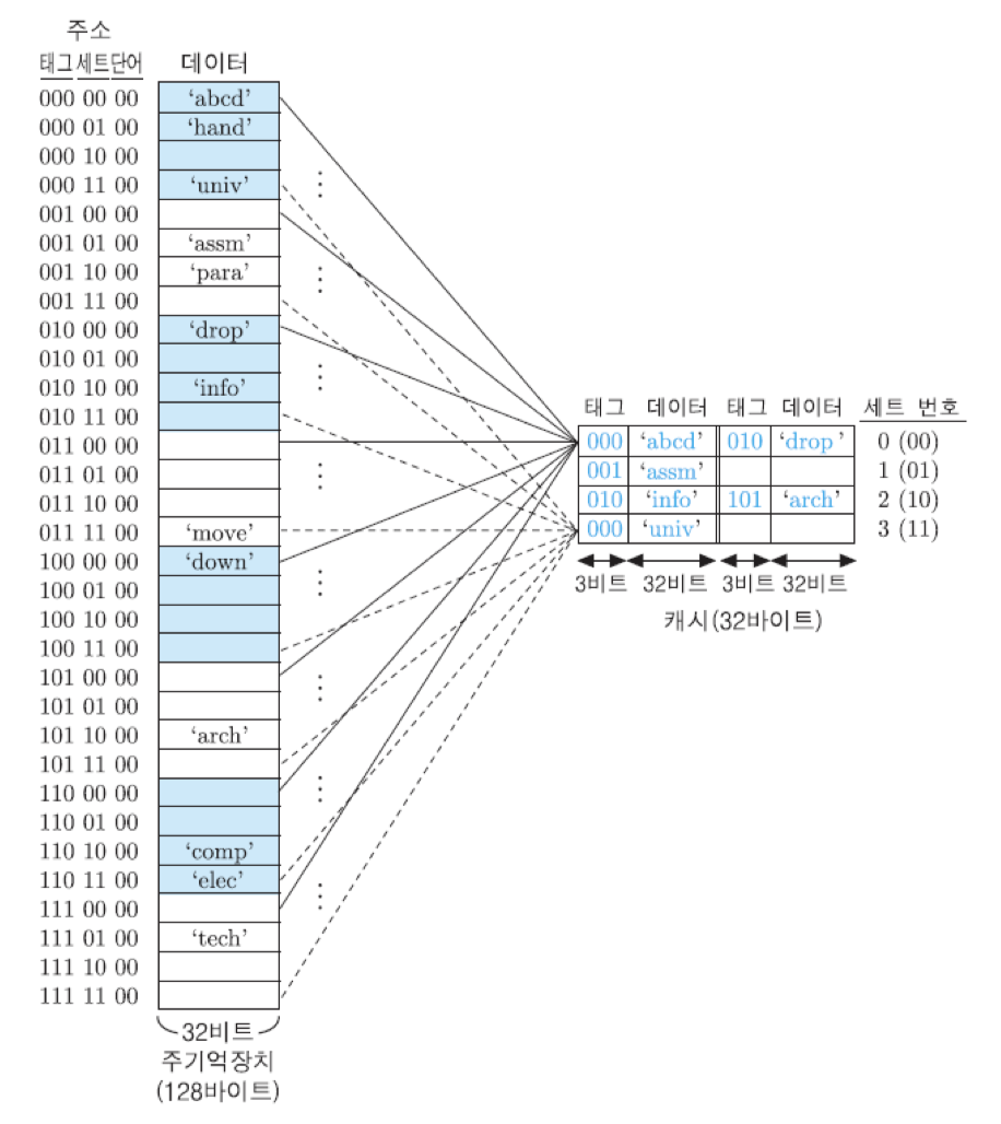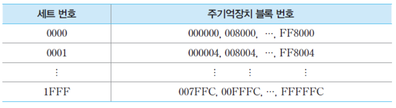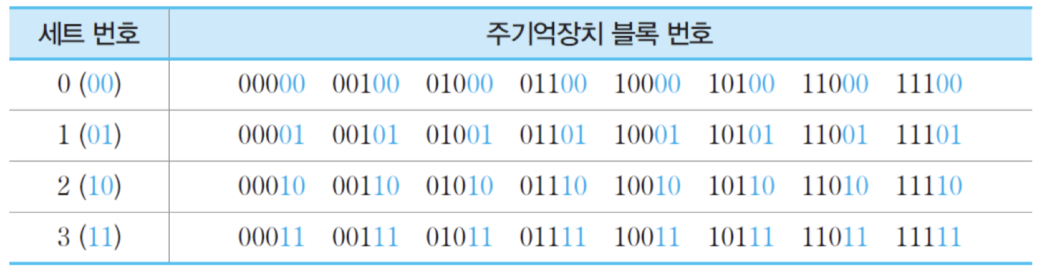 표를 보면, 주기억장치 블록 번호의 하위 두 비트가 '00'인 블록들은 모두 0번 세트를 공유하며, '01'인 블록들은 1번 세트, '10'인 블록들은 2번 세트, 그리고 '11'인 블록들은 3번 세트를 공유한다는 것을 알 수 있음. 그리고 각 세트를 공유하는 8개의 블록들은 앞의 세 비트들, 즉 태그값에 의해 구분될 수 있다는 것을 확인할 수 있음. 같은 세트를 공유하는 블록들 중의 두 개는 세트 내 두 라인들 중의 어느 곳에든 동시에 적재될 수 있음.