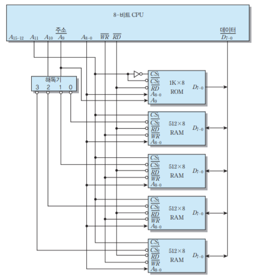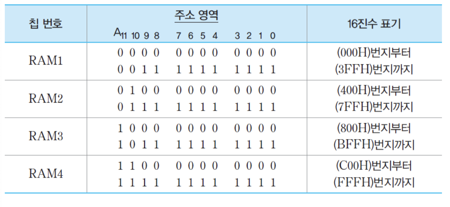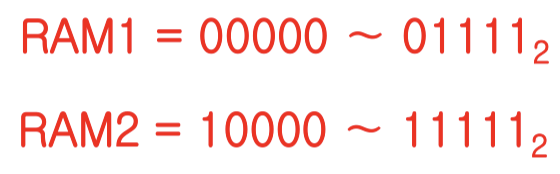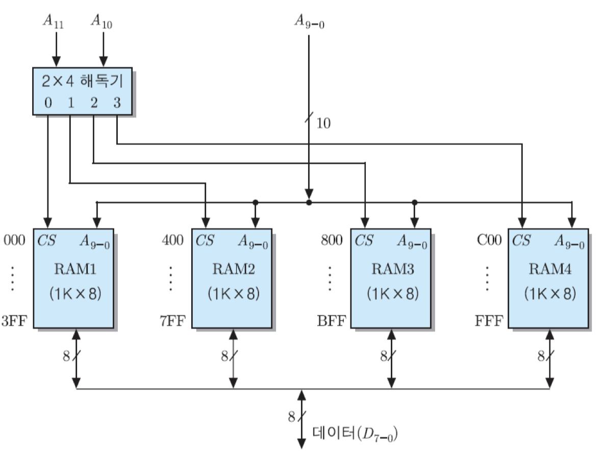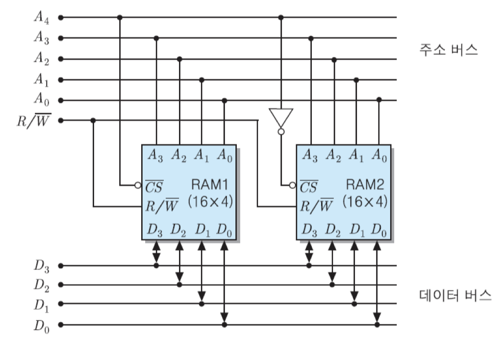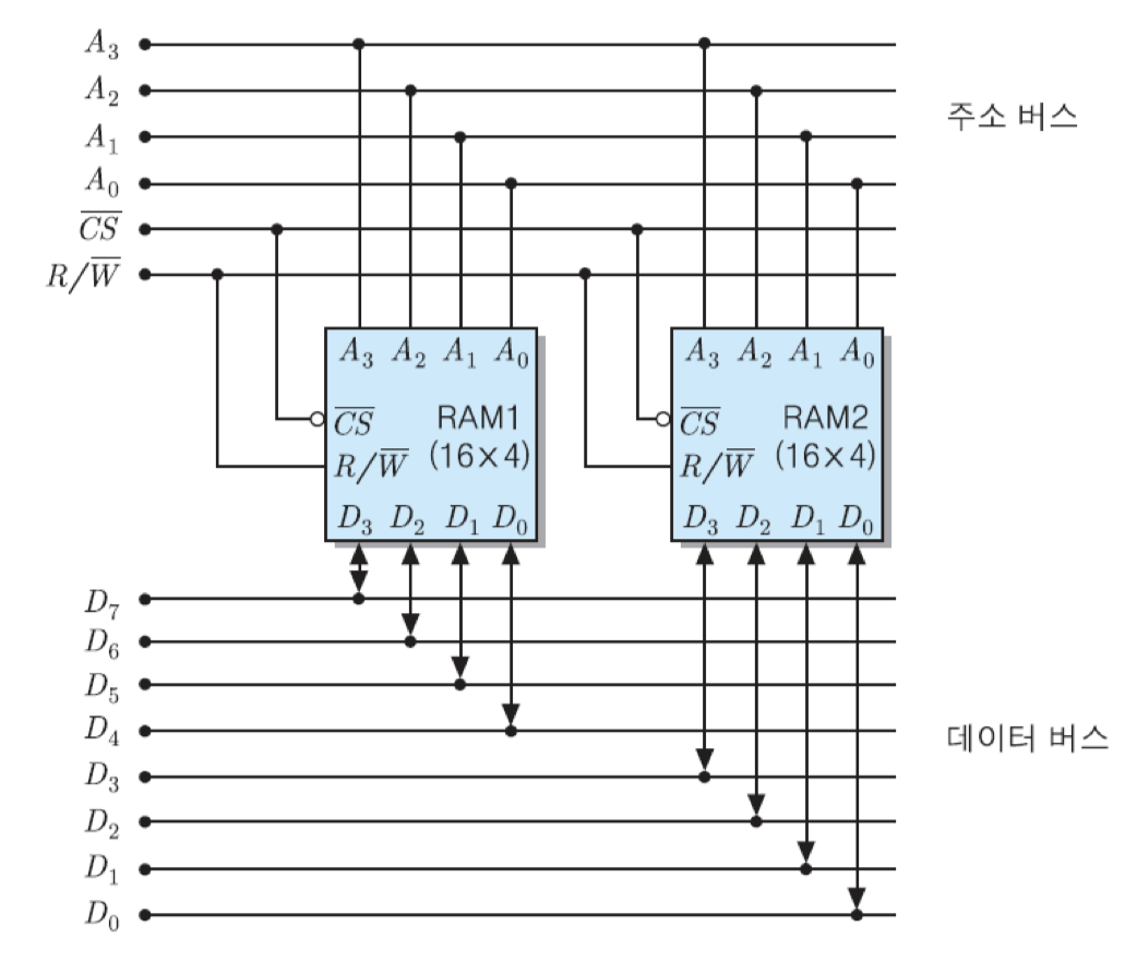 그렇게 되면, 두 RAM 칩에서 동일한 위치에 있는 기억 장소들에게 같은 주소가 배정됨. 즉, 이 예의 경우에 두 칩의 첫 번재 기억 장소들에게 모두 '0000'번지가 배정되며, 다음 기억 장소에는 '0001', ..., 그리고 마지막 기억장소에는 '1111'번지가 배정됨. 결과적으로, 전체 주소 영역은 0000~1111번지가 됨. 그리고 RAM1의 데이터 입출력 선들은 상위 데이터 버스 선들과 접속하고, RAM2의 데이터 선들은 하위 데이터 버스 선들과 접속함. 이와 같이 구성하게 되면, 어떤 한 기억 장소가 선택되었을 때 각 칩에서 4비트씩, 전체적으로 8-비트 데이터가 동시에 입력 혹은 출력되는 것임.
