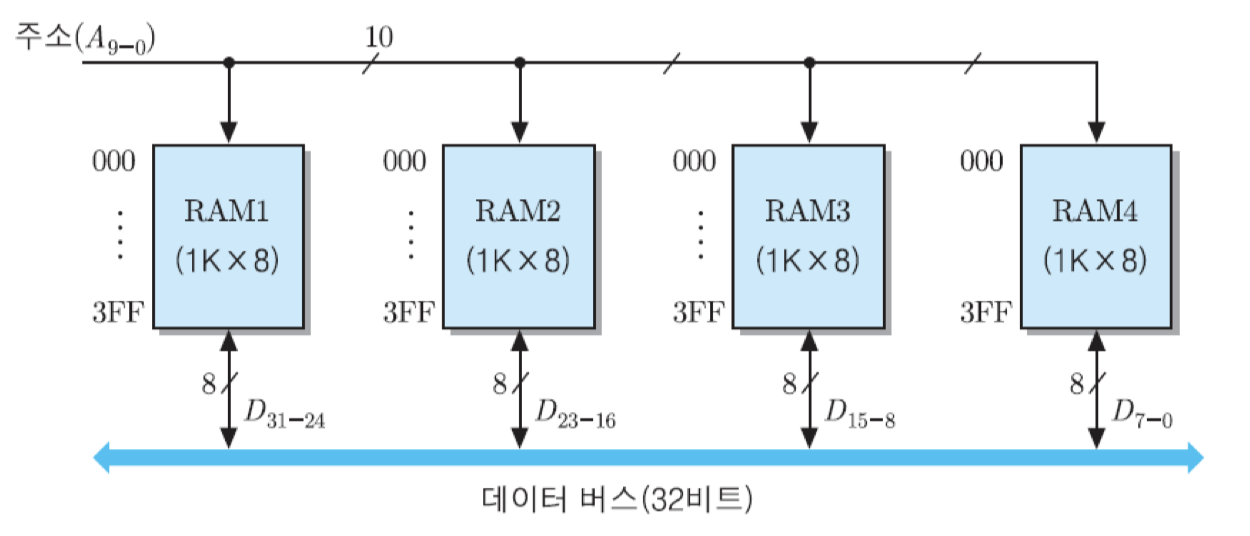 그림과 같이 32/8=4개의 RAM 칩들로 병렬로 접속하면 됨. 그렇게 접속하면, 모듈 내의 모든 칩들에 같은 주소를 가진 기억 장소들이 한 개씩 존재하게 됨. 이 경우에 각 주소에 저장될 32비트 데이터 중에서 최상위 8비트는 그림의 맨 좌측 칩에 저장하고, 그 다음 칩들에 순서대로 D23~D16, D15~D8, 그리고 맨 우측 칩에 최하위 비트들인 D7~D0를 각각 저장하면 됨.