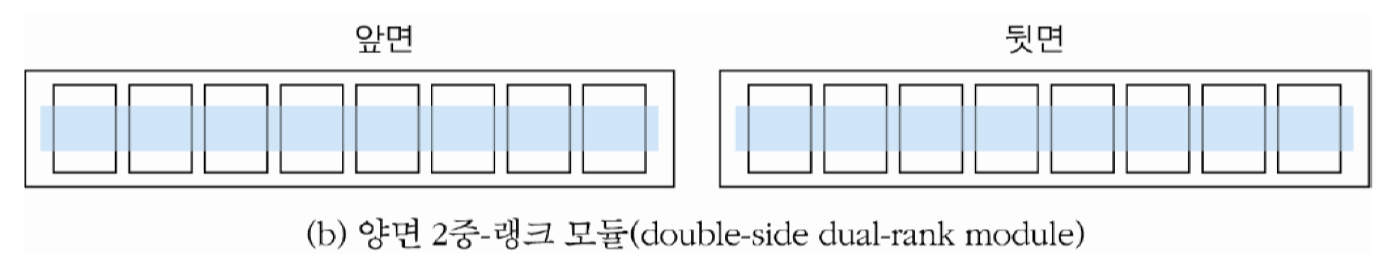 2중-랭크 모듈 : 양면 모듈(DIMM)에 서, x8 조직의 SDRAM들을 각 면에 8개씩 병렬 접속 하여 두 개의 랭크를 구성한 기억장치 모듈