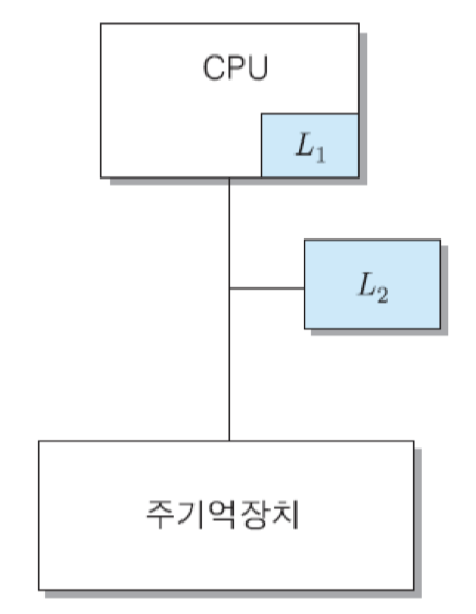 온-칩 캐시를 1차 캐시로 사용하고, 칩 외부에 더 큰 용량의 2차 캐시를 추가로 설치하는 방식