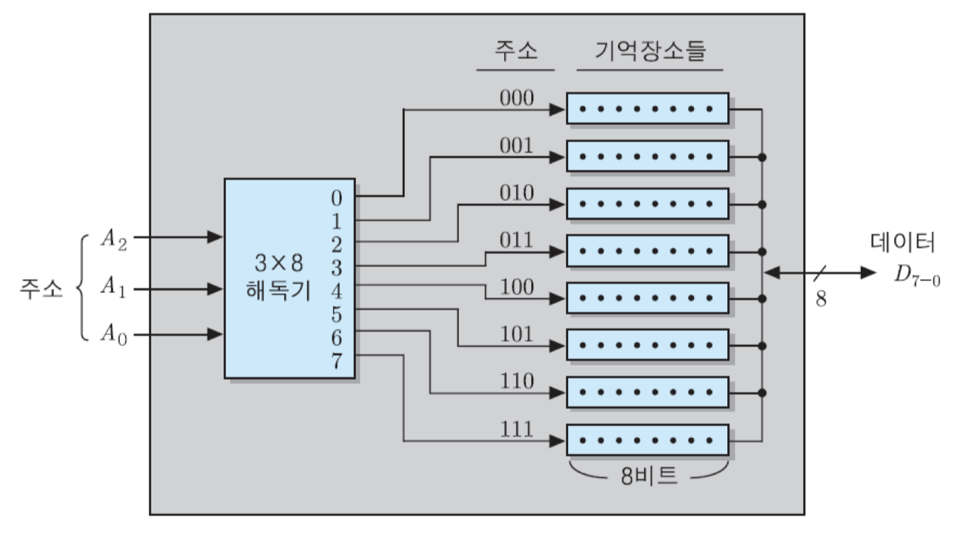 8개의 기억 장소들로 구성되며, 각 기억 장소에는 8비트씩 저장됨. 따라서 전체 용량은 64비트가 됨. 그리고 기억 장소는 8개이므로 세 개의 주소 비트들로 그들의 주소를 모두 지정할 수 있으며, 주소의 범위는 0번지부터 7번지까지가 됨. 칩 내의 3 x 8 해독기는 주소 비트들을 해독하여 8개의 출력들 중의 하나를 활성화시킴. 그러면 그 출력 선이 연결된 기억 장소가 선택되고, 제어 신호에 따라 읽기 혹은 쓰기 동작이 수행됨. 한 번의 읽기 혹은 쓰기 동작이 수행될 때 동시에 입출력되는 데이터 비트 수가 8개이기 때문에, 데이터 입출력 선은 8개가 필요함.