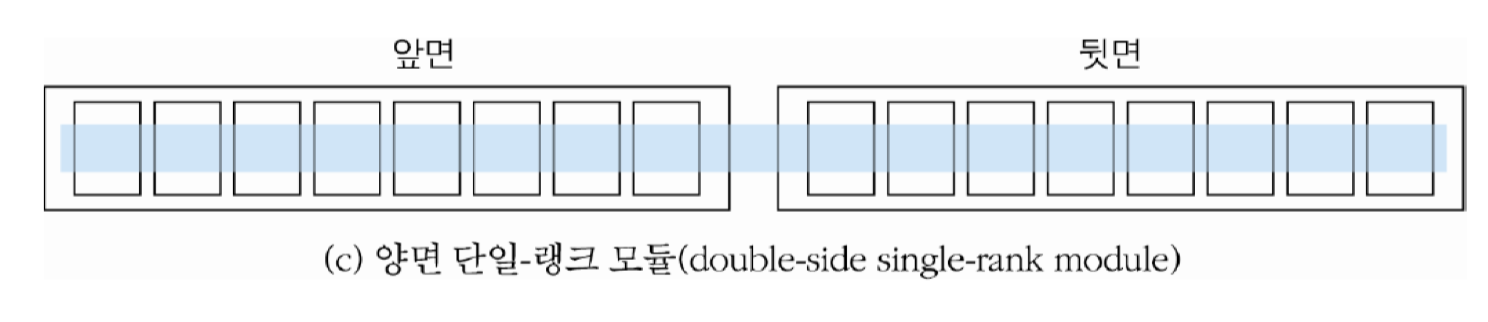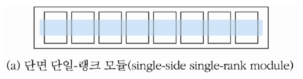 단일-랭크 모듈 : 단면 모듈(SIMM) 상에 x8 조직의 SDRAM 8개를 병렬접속 하여 하나의 랭크 를 구성함으로써, 64비트 데이터가 한 번에 버스를 통하여 전송되도록 구성한 기억장치 모듈