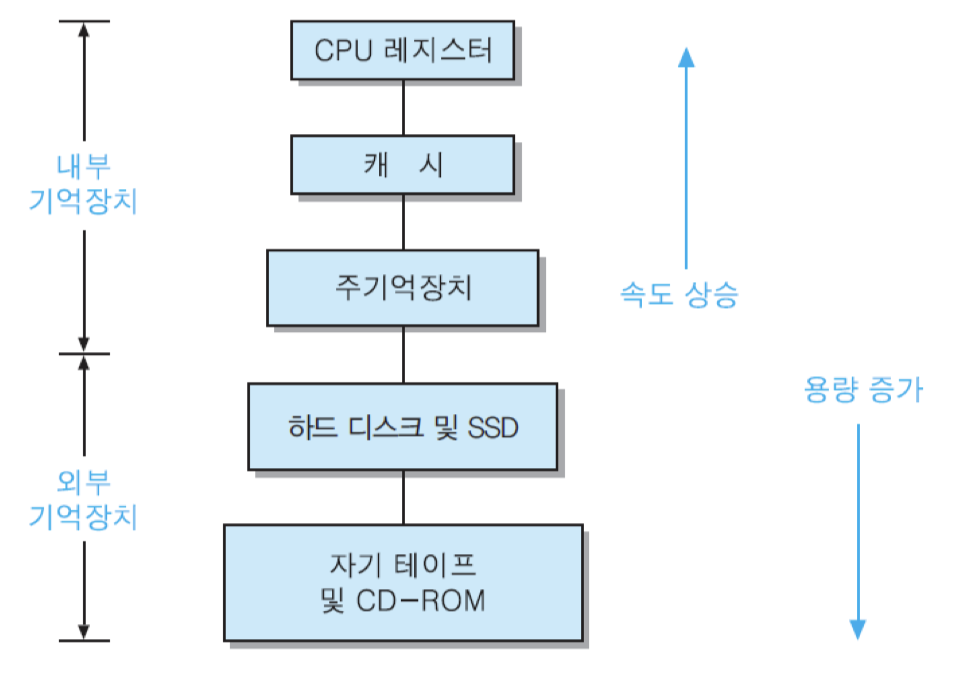 모든 컴퓨터시스템은 프로그램과 데이터를 저장하기 위한 장치로서 주기억장치와 보조저장장치를 가지고 있음. 그러나 최근 CPU와 기억장치들 간의 속도 차이가 커지고 필요한 저장 용량이 증가함에 따라, 시스템 성능을 향상시키고 가격대성능비를 개선하기 위하여 다양한 유형의 기억장치들을 시스템에 포함시키고 있음. 기억장치는 CPU가 직접 액세스할 수 있는 내부 기억장치와 장치 제어기를 통하여 앨세스할 수 있는 외부 기억장치로 구성됨.