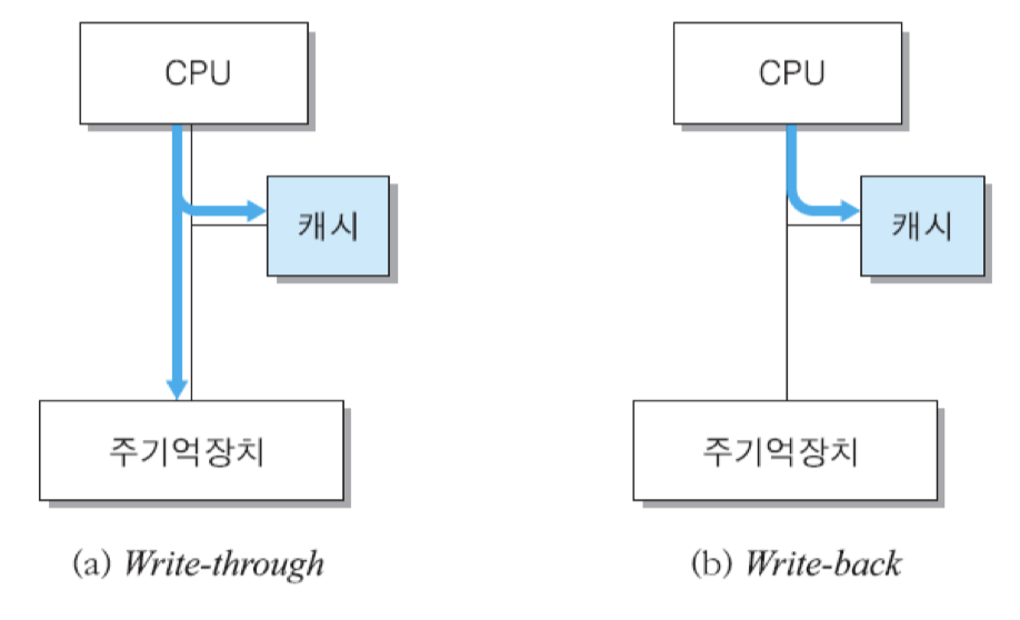 쓰기 정책 : 캐시에 적재된 데이터를 새로운 값으로 변경할 때 주기억장치에 갱신하는 시기와 방법을 결정하는 방식