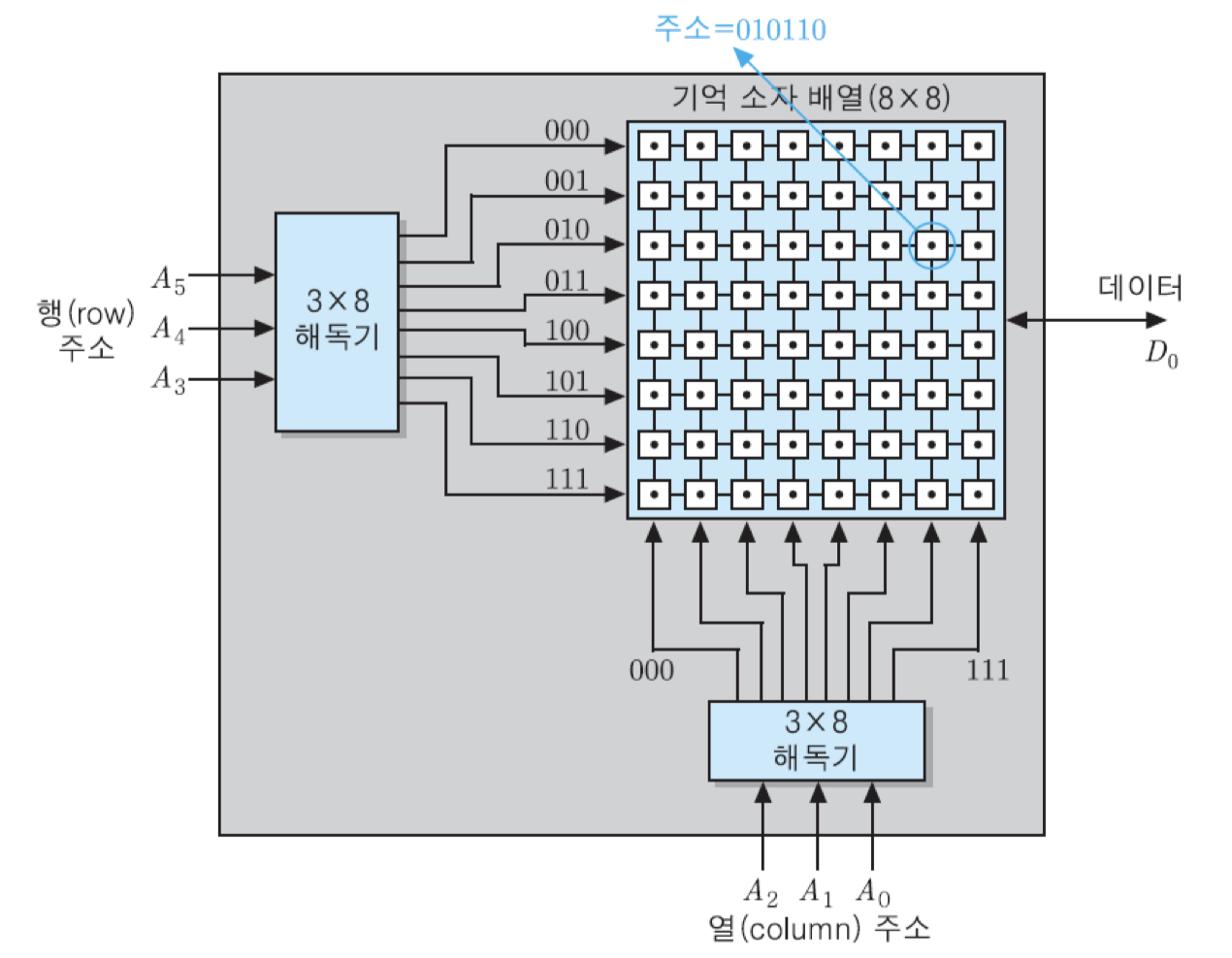 그런데 이러한 조직에서는 일반적으로 주소 비트들이 두 그룹으로 나누어져 별도로 해독됨. 주소 비트들 중에서 상위 세 비트는 8개의 행들 중에서 한 개를 선택하고, 하위 세 비트들은 8개의 열들 중에서 한 개를 선택함. 따라서 두 개의 3 x 8 해독기가 필요함. 이 방법으로 주소가 지정되는 예를 보면, 그림에서 세 번째 행의 일곱 번째 기억 소자의 주소는 010110이 됨.