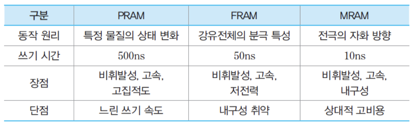 PRAM : 화합물 반도체의 상태 변화를 이용하여 2진 정보를 저장하는 RAM