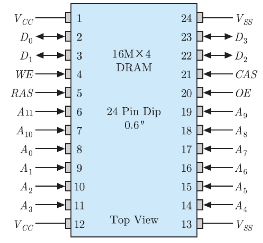 그림은 위의 DRAM을 패키징하여 24개의 핀들을 가진 칩으로 만들어진 모습을 보여주고 있음. 그림에서 Vcc는 전원 공급 핀이며, Vss는 접지 핀을 나타냄. 2번, 3번, 22번 및 23번이 데이터 입출력 핀들이며, 아래편의 12개 핀들이 주소 핀임. 4번의 WE 핀은 쓰기 신호 선이고, 20번의 OE 핀은 출력 활성화 신호, 즉 읽기 신호 핀을 가리킴. 그리고 5번과 21번 핀으로는 각각 RAS 및 CAS 신호가 인가됨.