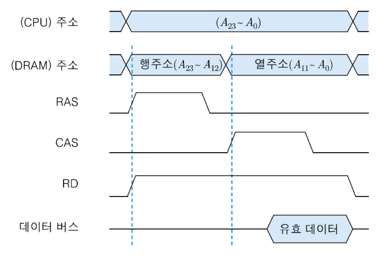 그림에서 'CPU 주소'란 CPU가 발생한 전체 24개의 주소 비트들을 말하는데, 그들 중에서 상위 12개 비트들이 먼저 선택되어 DRAM칩의 주소 입력으로 들어옴. 그 상위 주소 비트들은 4096개의 행들 중의 하나를 선택하는 행 주소로 사용되는데, 그들은 RAS(기억장치의 행 주소 래치 신호) 신호에 의해 행 주소 버퍼에 래치 됨. 그 다음 순간에는 열 주소로 사용될 하위 12비트들이 선택되어 DRAM으로 전송되는데, 그들은 CAS(기억장치의 열 주소 래치 신호) 신호에 의해 열 주소 버퍼에 래치 됨.