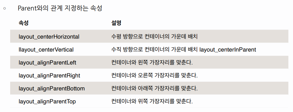 뷰를 위젯끼리나 컨테이너(Parent) 끼리의 위치관계로 배치하는 레이아웃