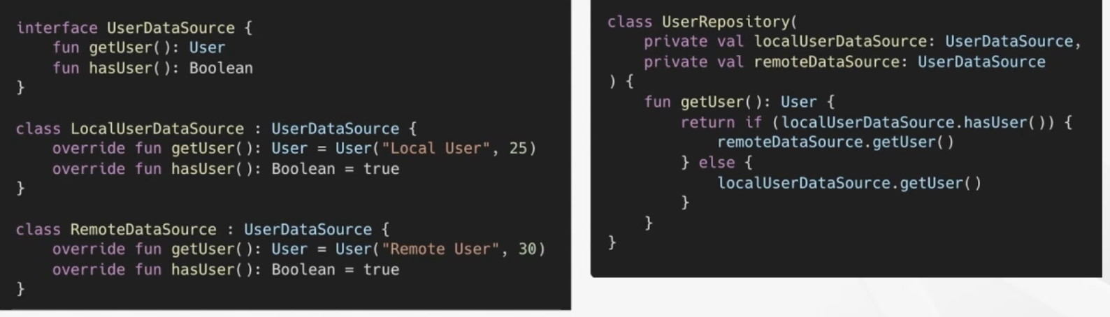 UserRepository에서는 local과 remote변수를 사용하는데 각각 UserDataSource 인터페이스이기 때문에 그것이 무엇인지 알 수 없다. 따라서 의존성이 사라진다.