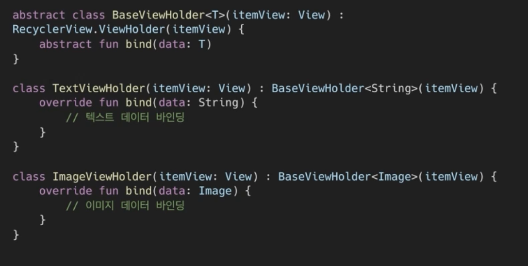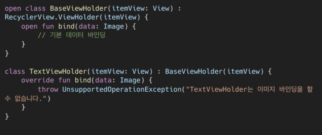 새로운 뷰홀더를 추가하게 될 경우에도, 기존 코드를 수정할 필요 없이, 확장하기만 하면 된다.
