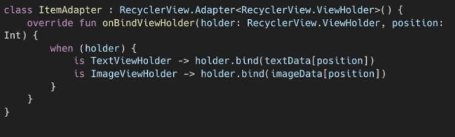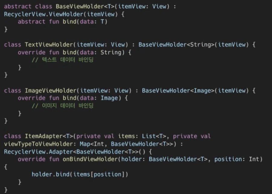 위 코드는 새로운 뷰홀더가 생길때마다, onBindViewHolder() 안의 코드를 수정해야 한다.