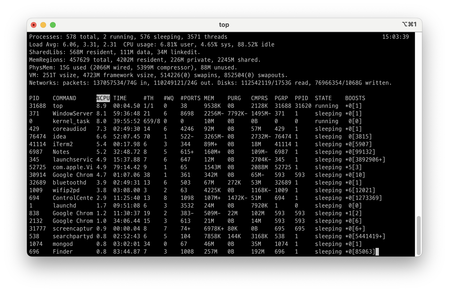 ps 명령어가 시스템 동작에 관한 많은 정보를 주긴 하지만 오직 ps 명령어가 실행된 순간의 상태에 대해서만 제공한다. 시스템의 활동을 좀 더 동적으로 보기 위해서는 top 명령어를 사용하면 된다.