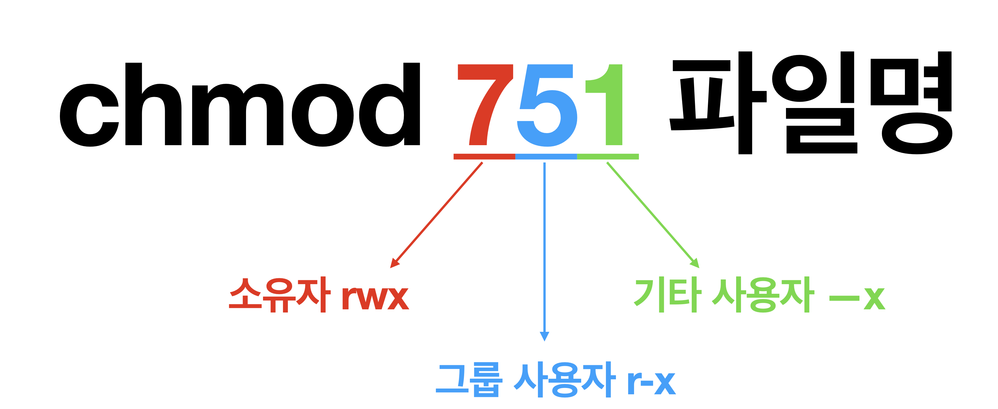 마지막 자리는 기타 사용자의 권한을 나타내며, 그 권한이 --x(실행)이 가능하다는 의미이다.