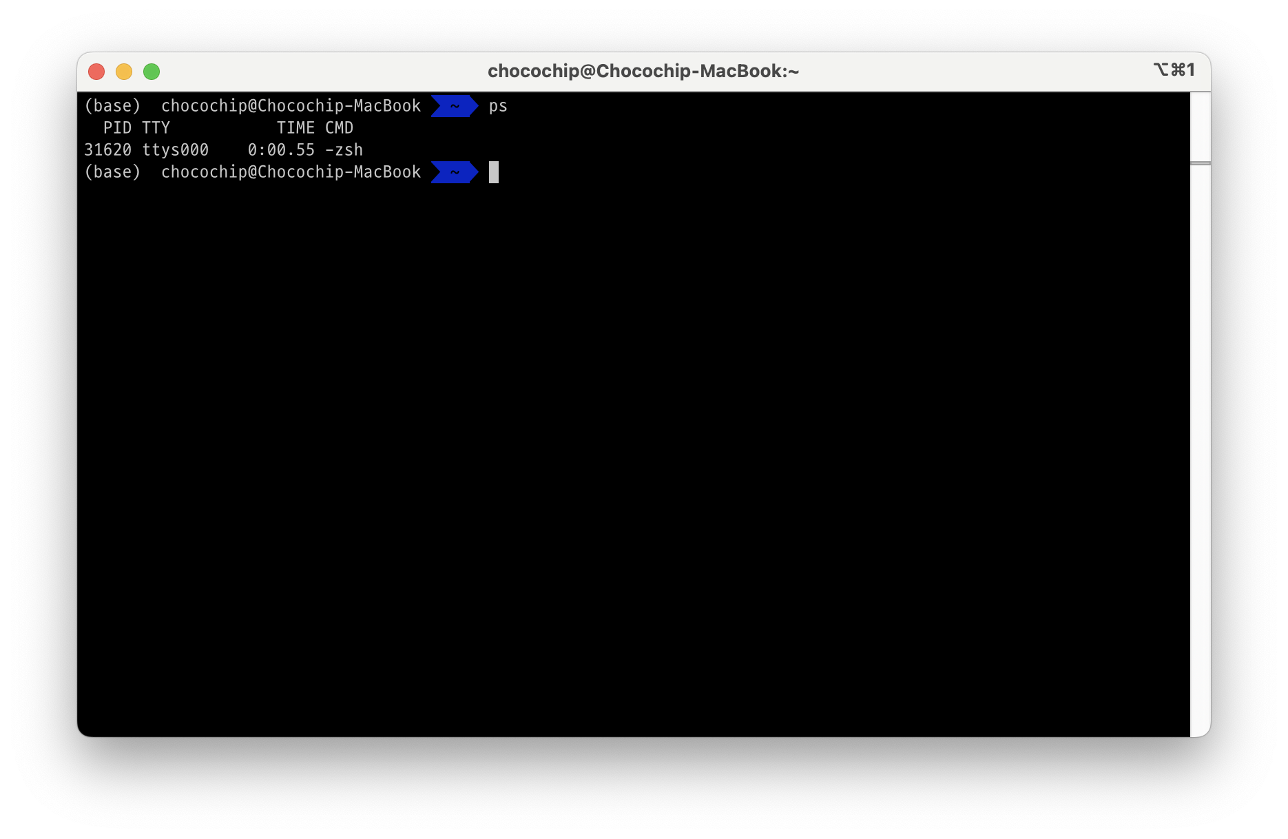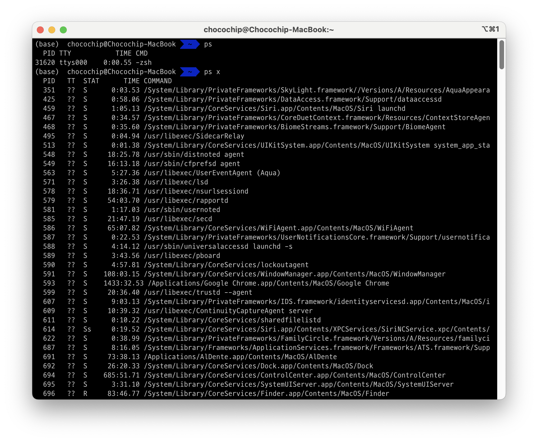 위 그림에서 ps의 결과로 하나의 프로세스를 나열한다. 프로세스 31620인 -zsh를 나타낸다. 볼 수 있듯이, ps는 많은 정보를 보여주지 않는다. 단지 현재 터미널 세션과 관련된 프로세스만 보여준다.